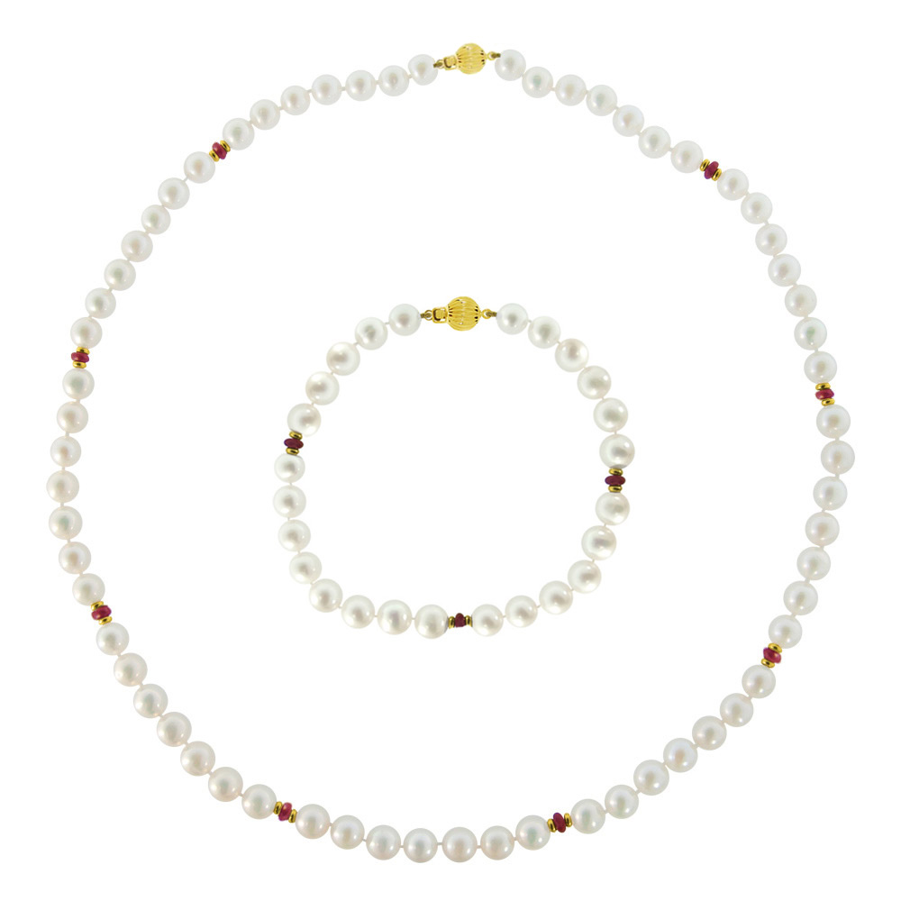 1. Ένα φανταστικό κολιέ με στρογγυλοποιημένα λευκά μαργαριτάρια γλυκού νερού Fresh Water Pearl διαμέτρου 6 - 6,5 χιλιοστώνΑνάμεσα στα μαργαριτάρια υπάρχουν 8 διάσπαρτοι πολύτιμοι λίθοι  φασεταρισμένα ρουμπίνια διαμέτρου 2,5 - 4 χιλιοστών. Το κολιέ έχει επίσης 16 χρυσές ροδέλες 14 καρατίων τοποθετημένες δεξιά και αριστερά από τους πολύτιμους λίθους και ένα χρυσό κούμπωμα ασφαλείας 14 καρατίων.