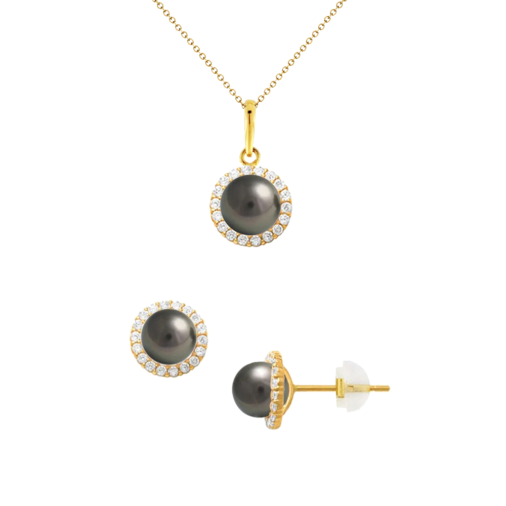 Σετ Κ14 χρυσό μενταγιόν και σκουλαρίκια με μαύρα μαργαριτάρια και ζιργκόν - S124533B