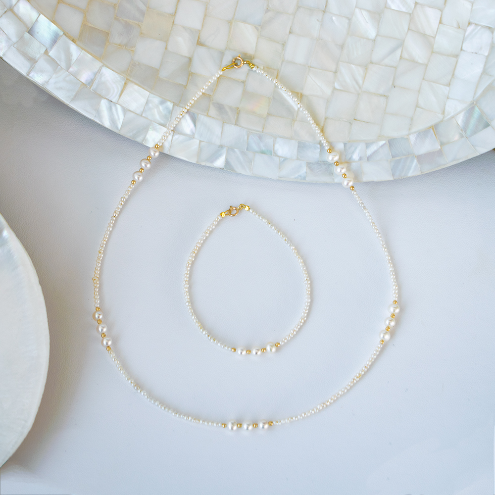 Σετ κολιέ, βραχιόλι Κ14 χρυσό κούμπωμα και στοιχεία με μαργαριτάρια - M124970