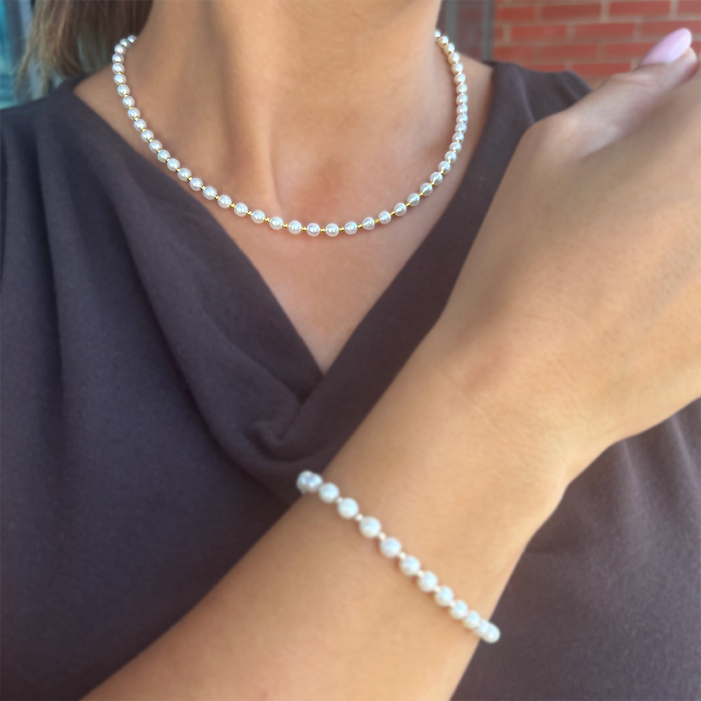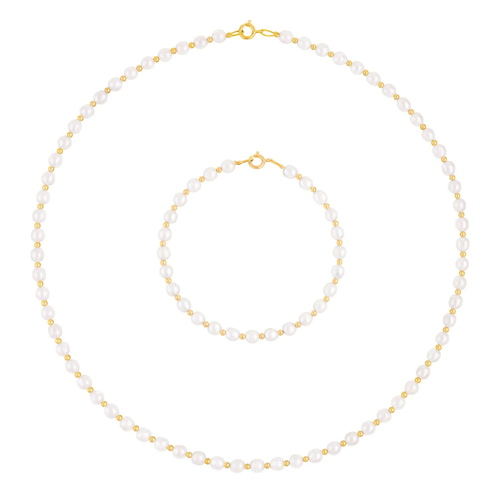 Σετ κολιέ & βραχιόλι με Κ14 χρυσά στοιχεία και λευκά μαργαριτάρια - S125970S
