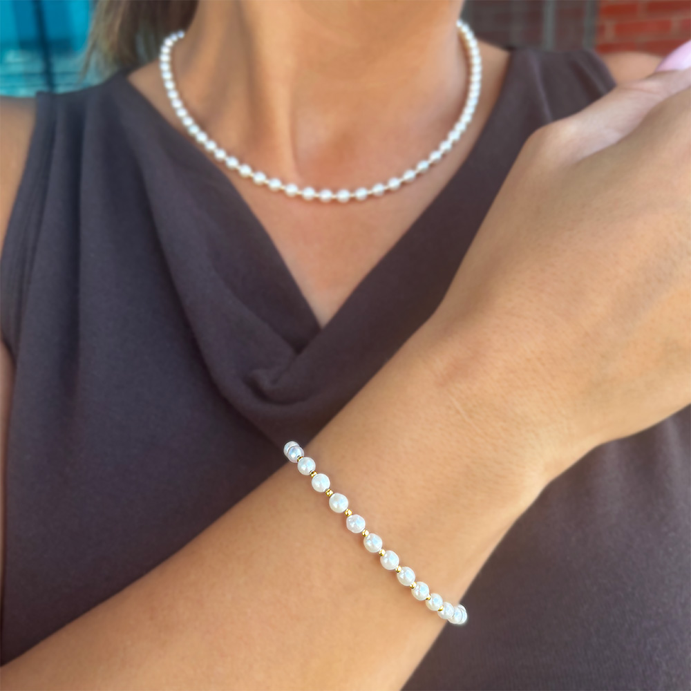 • Ένα βραχιόλι με λευκά στρόγγυλα μαργαριτάρια Fresh Water Pearl διαμέτρου 4,5 χιλιοστών, εξαιρετικού γυαλίσματος και 26 χρυσά στοιχεία 14 καρατίων ανάμεσα στα μαργαριτάρια. Το κούμπωμά του είναι χρυσό 14 καρατίων και το συνολικό του μήκος είναι 18-19 εκατοστά, όμως μπορείτε να το παραγγείλετε στο μήκος που επιθυμείτε.