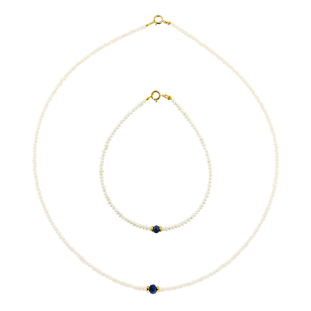 Σετ κολιέ και βραχιόλι με Κ14 χρυσά στοιχεία, μαργαριτάρια και ζαφείρια - M990051