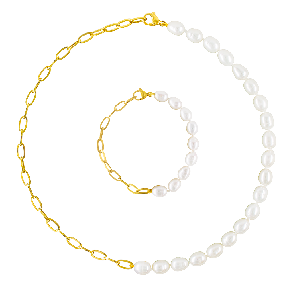 • Το σετ αποτελείται από ένα υπέροχο λαμπερό κολιέ και ένα βραχιόλι με επιχρυσωμένη αλυσίδα από ατσάλι και λευκά μαργαριτάρια Fresh Water Pearl διαστάσεων 8 x 10 χιλιοστά σε σχήμα Long.
