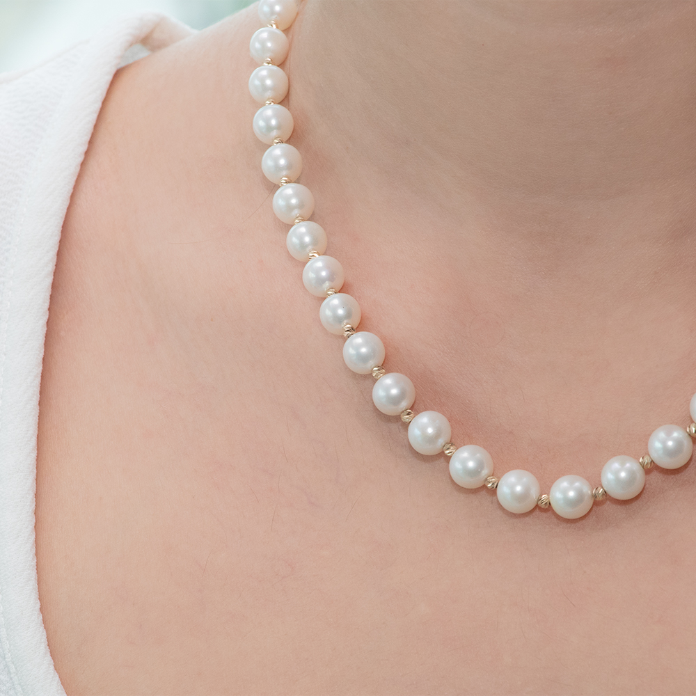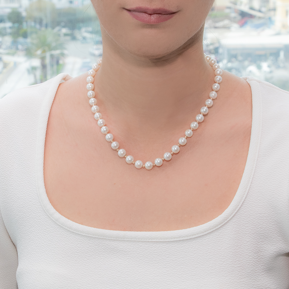 Ένα υπέροχο κολιέ με λευκά μαργαριτάρια Fresh Water Pearl διαμέτρου 8 χιλιοστών σε σχήμα Round.