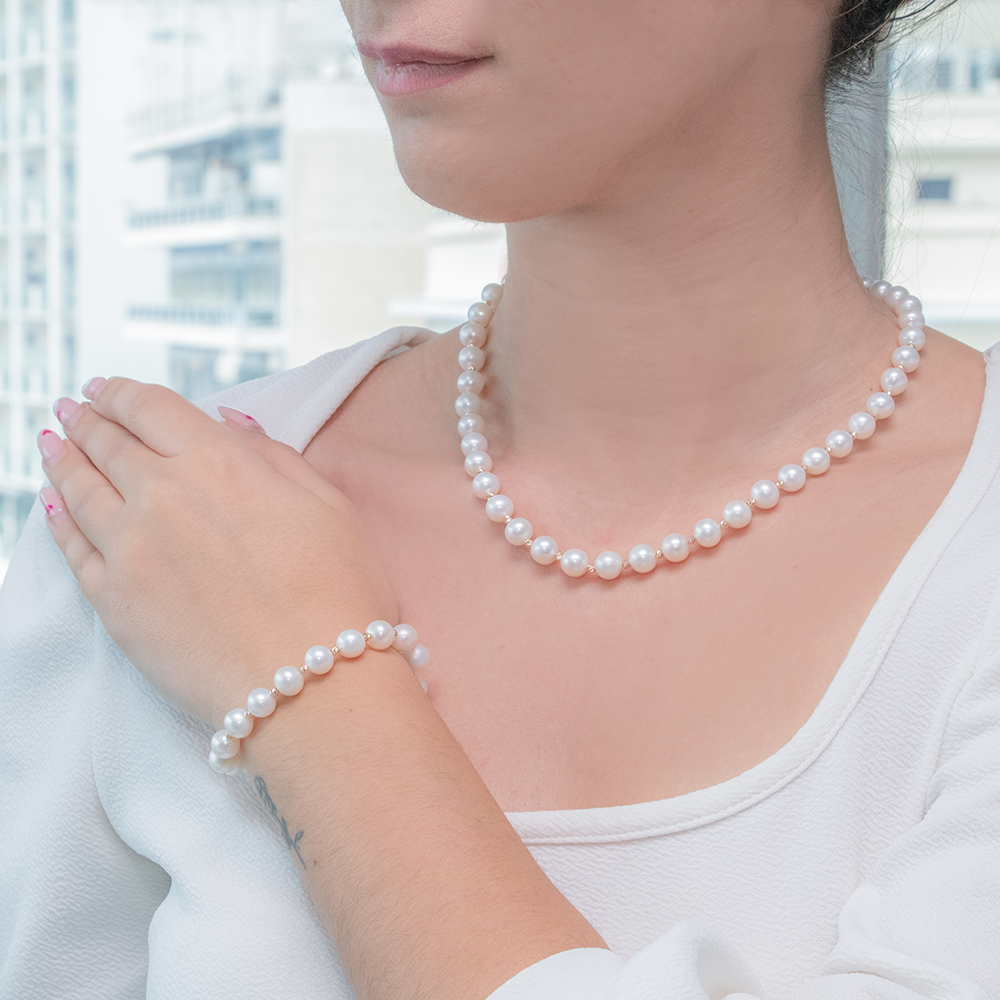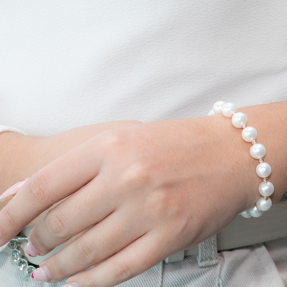 • Ένα εντυπωσιακό βραχιόλι με λευκά μαργαριτάρια γλυκού νερού Fresh Water Pearl διαμέτρου 8 χιλιοστών, άριστης ποιότητας