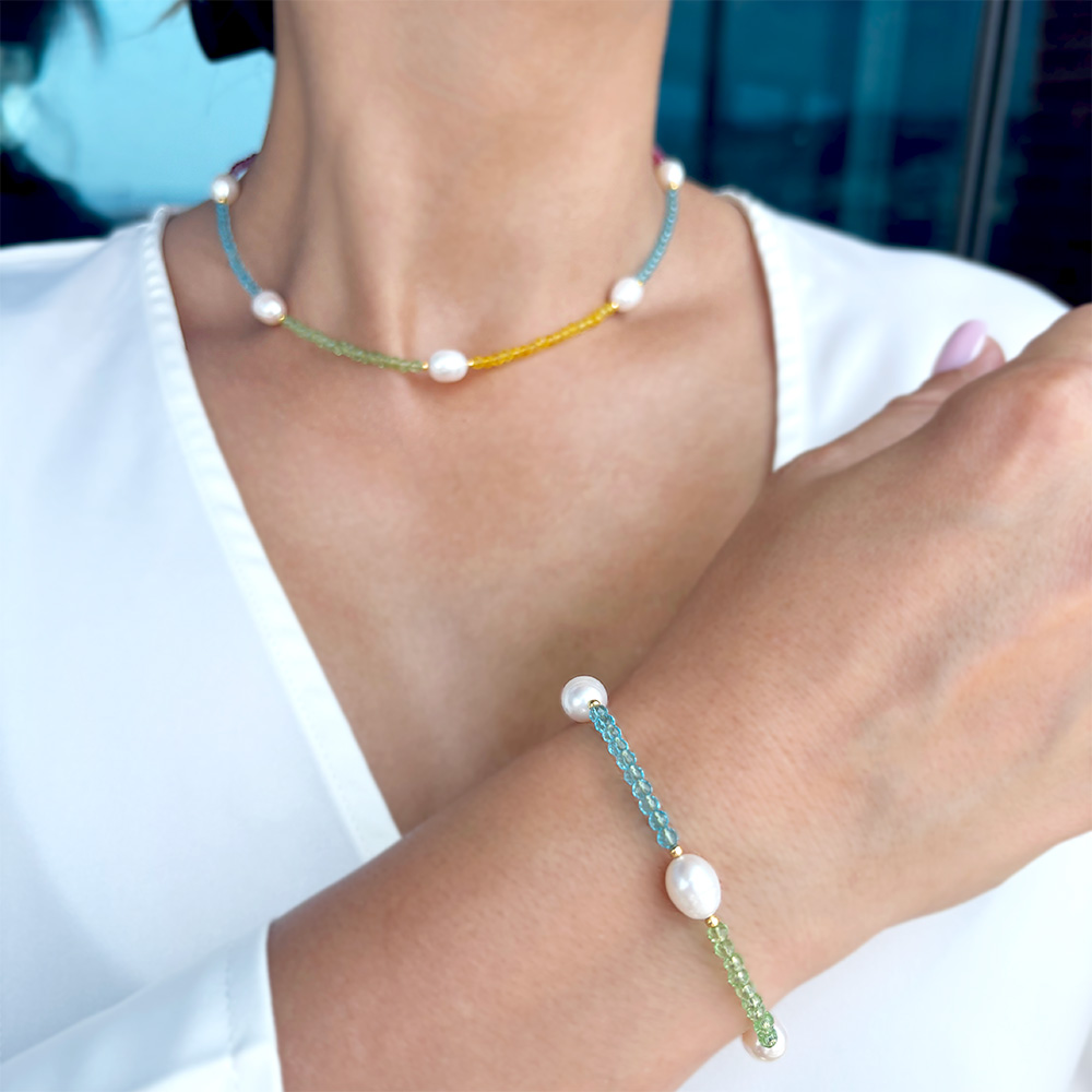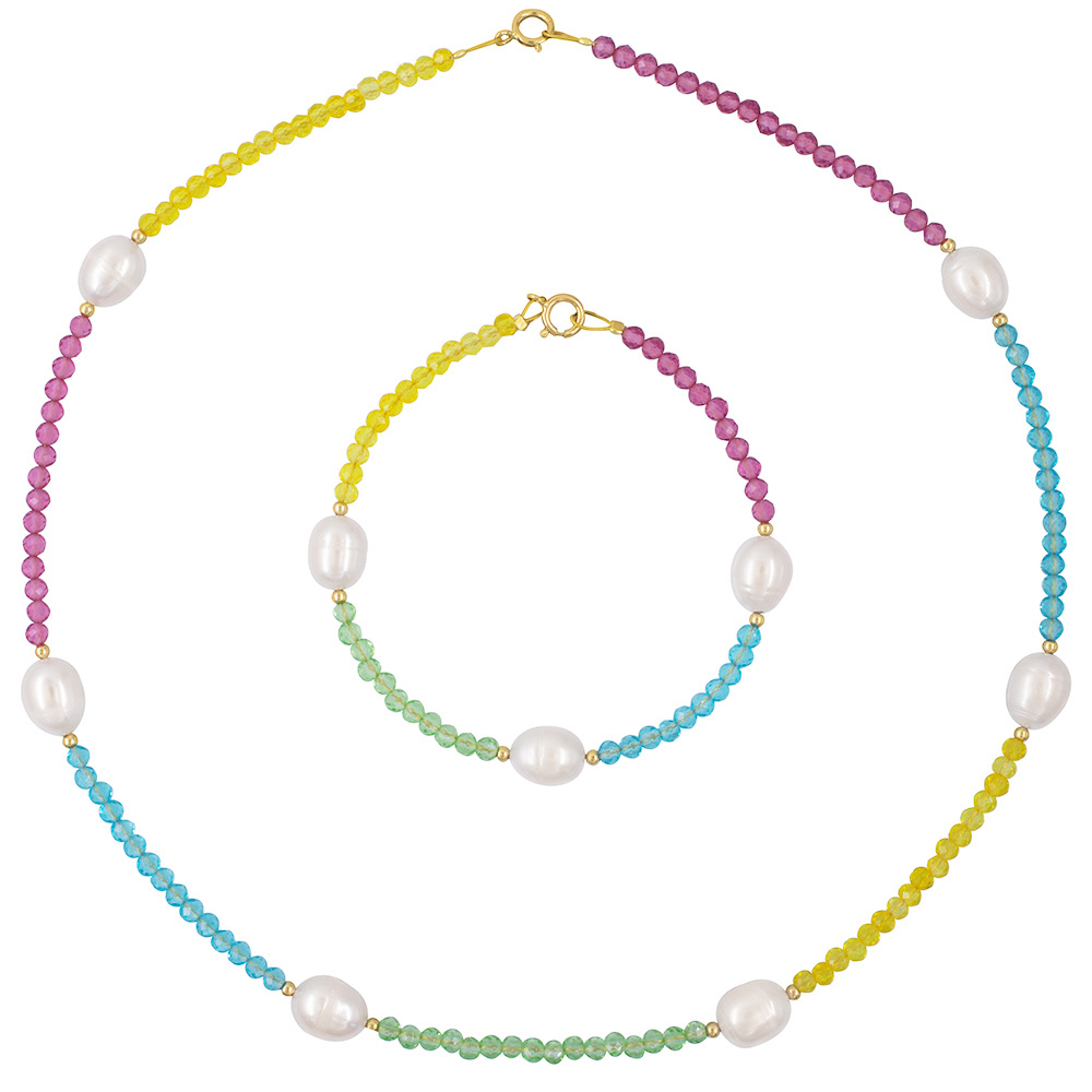 Σετ κολιέ και βραχιόλι με Κ14 χρυσά στοιχεία, πολύχρωμα salomite και λευκά μαργαριτάρια - S126371