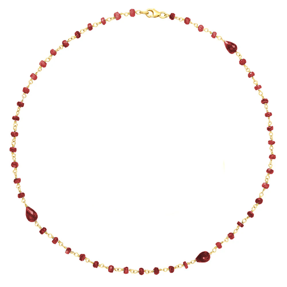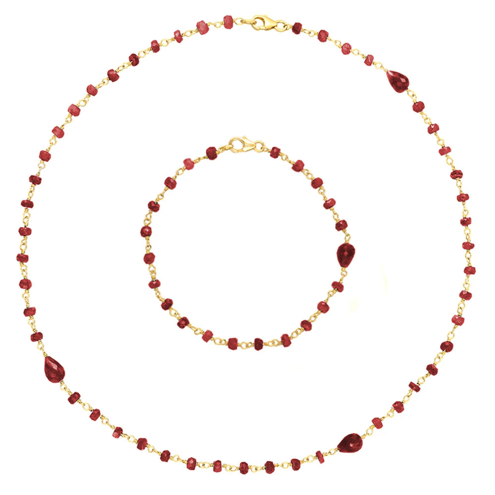 • Ένα υπέροχο σετ με κολιέ και βραχιόλι με ρουμπινίτες σε επιχρυσωμένη αλυσίδα από ασήμι 925. Το κολιέ αποτελείται από: