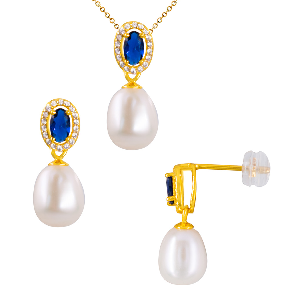 • Ένα κολιέ με 925 ασημένιο επιχρυσωμένο μενταγιόν ένα οβάλ πλυεδρικό μπλε ζιργκόν, το οποίο αγκαλιάζουν περιμετρικά λευκά ζιργκόν. Από το μενταγιόν κρέμεται ένα λευκό μαργαριτάρι Fresh Water Pearl διαμέτρου 8x10 χιλιοστών. Διαθέτει αλυσίδα 925 ασημένια επιχρυσωμένη συνολικού μήκους 48 εκατοστών, όμως υπάρχει και κρίκος στα 42 εκατοστά, για να φορεθεί στο μήκος που επιθυμείτε.