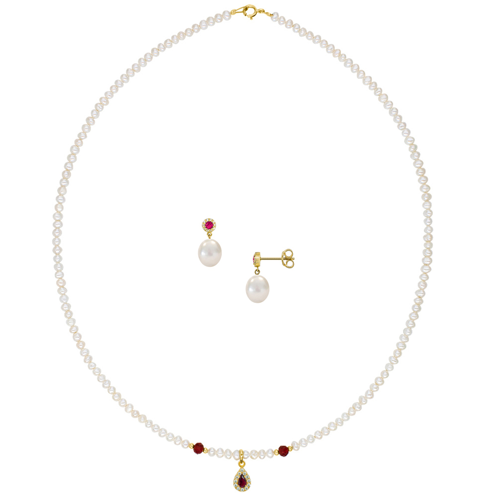 Σετ κολιέ και σκουλαρίκια με Κ14 χρυσά στοιχεία, λευκά μαργαριτάρια και κόκκινα ζιργκόν - S124257R