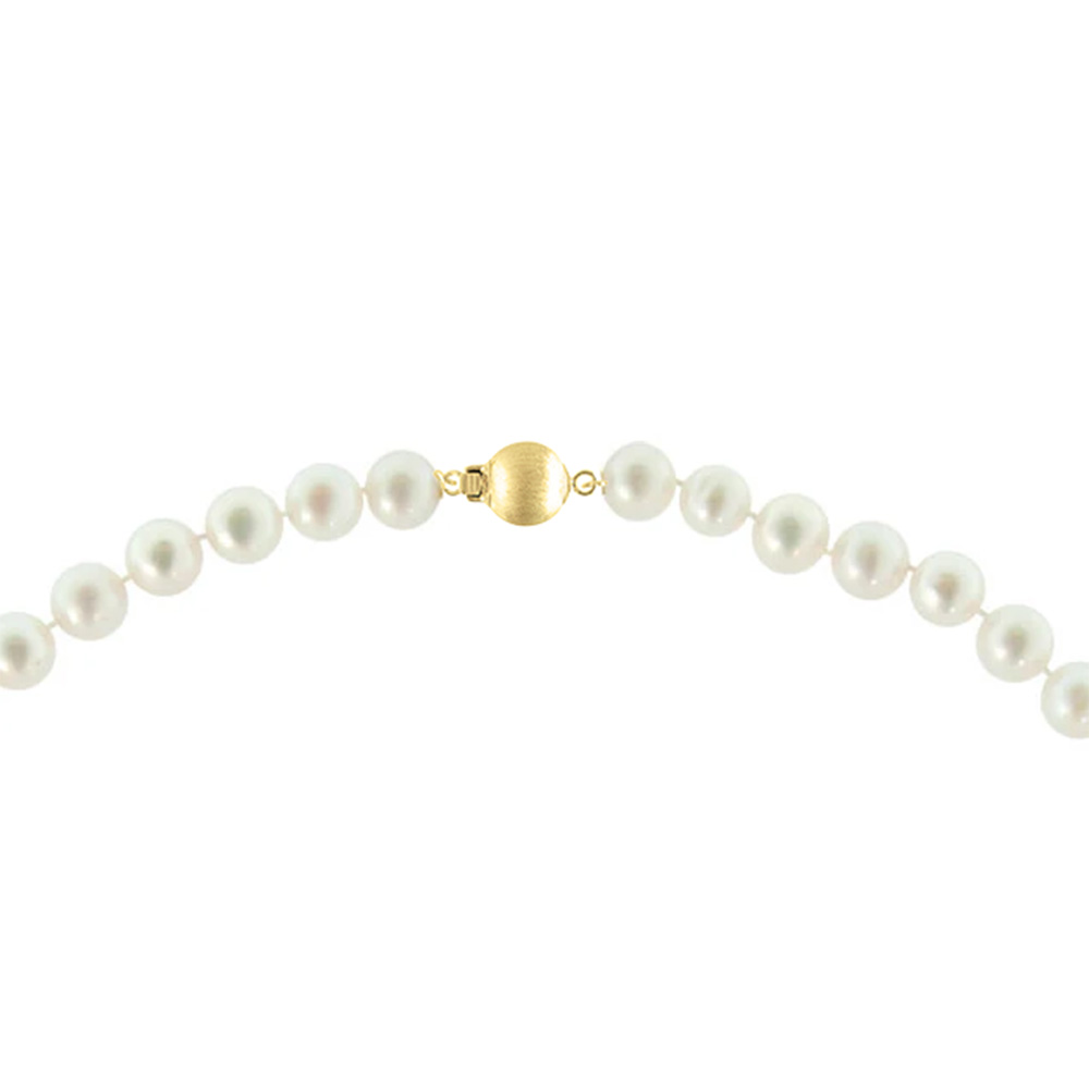 • Ένα υπέροχο κολιέ με λευκά στρόγγυλα μαργαριτάρια Fresh Water Pearl διαμέτρου 8 - χιλιοστών, άριστης ποιότητας. Είναι δεμένο με χρυσό κούμπωμα διπλής ασφάλειας 14 καρατίων satine ματ μπίλια χρυσού χρώματος, ενώ το μεταξωτό νήμα δημιουργεί κόμπους ενδιάμεσα στα μαργαριτάρια για λόγους προστασίας και ασφάλειας. Το συνολικό του μήκος είναι 43-44 εκατοστά, όμως μπορείτε να το παραγγείλετε στο μήκος που επιθυμέιτε.