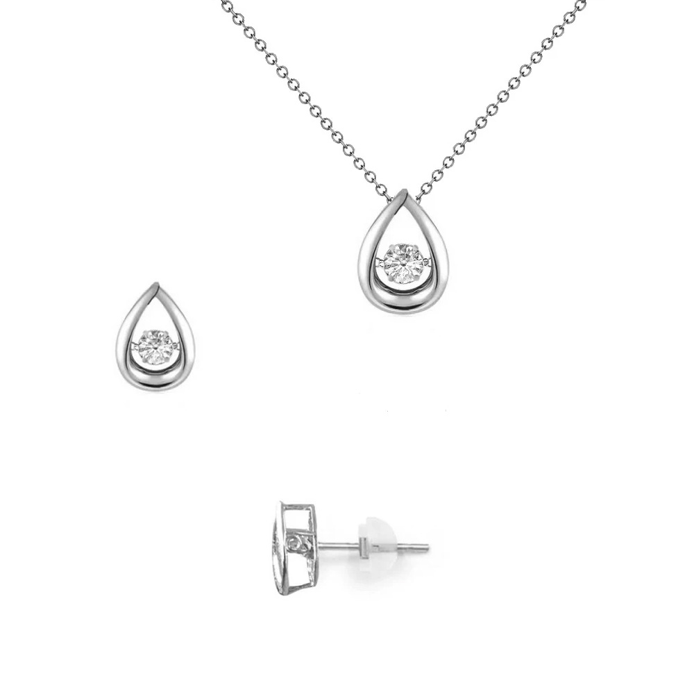 • Ένα ζευγάρι καρφωτά σκουλαρίκια λευκόχρυσα 18 καρατίων σε σχήμα σταγόνας. Στο εσωτερικό υπάρχουν 2 διαμάντια συνολικού βάρους 0,10 καρατίων, το οποίο είναι moving και κινείται σε κάθε κίνηση. Τα διαμάντια καθαρότητας VS1 και κοπής Brilliant είναι τοποθετημένα σε μία βάση λευκόχρυση Κ18, η οποία δίνει κίνηση στα BrilliantΤα κουμπώματα είναι με σιλικόνη που στο εσωτερικό τους έχουν λευκόχρυσο Κ18 μέταλλο και είναι ιδανικό για γυναίκες που έχουν αλεργία σε μέταλλο όπως ο χρυσός.