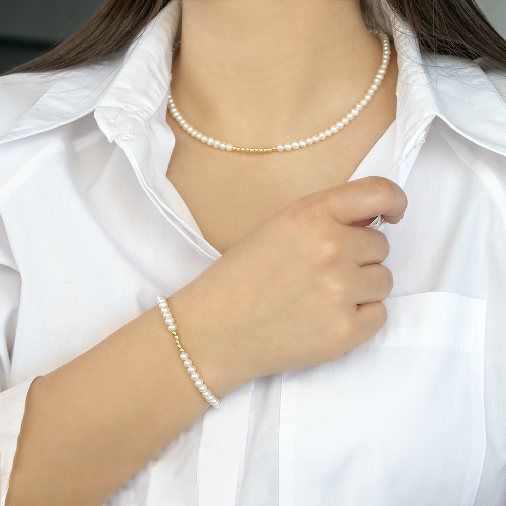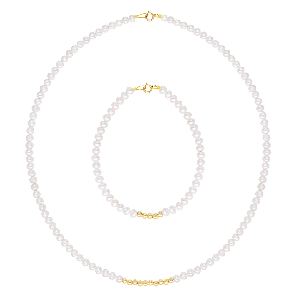 Σετ κολιέ και βραχιόλι με Κ14 χρυσά στοιχεία και λευκά μαργαριτάρια - F124736