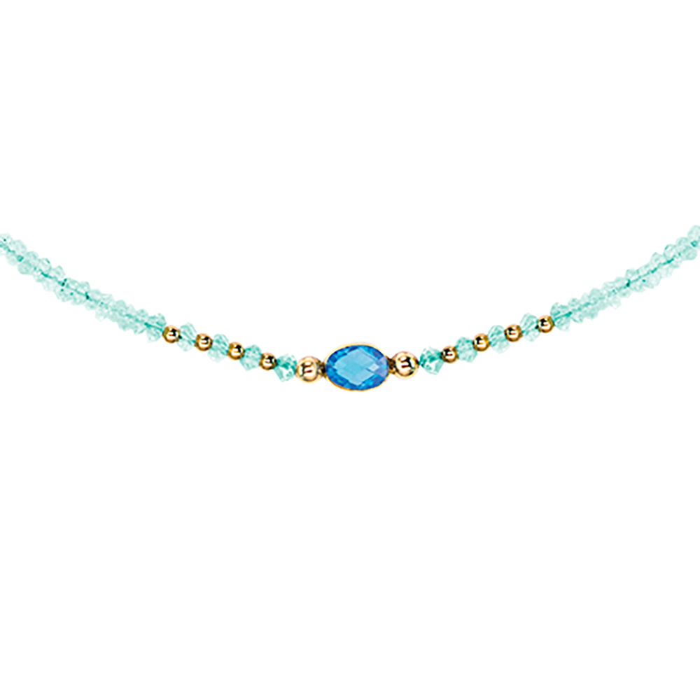 • Ένα εντυπωσιακό κολιέ με ημιπολύτιμο λίθο Aqua διαμέτρου 2-2,5 χιλιοστών και χρυσό κούμπωμα Κ14.