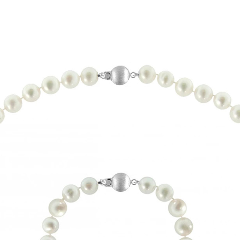 • Ένα υπέροχο κολιέ με λευκά στρόγγυλα μαργαριτάρια Fresh Water Pearl διαμέτρου 9 - 10 χιλιοστών. Είναι δεμένο με λευκόχρυσο κούμπωμα διπλής ασφάλειας 14 καρατιών satine ματ μπίλια λευκού χρώματος, ενώ το μεταξωτό νήμα δημιουργεί κόμπους ανάμεσα στα μαργαριτάρια για λόγους προστασίας και ασφάλειας. Το μήκος του είναι 43-45 εκατοστά, όμως μπορείτε να το παραγγείλετε σε όποιο μήκος επιθυμείτε.