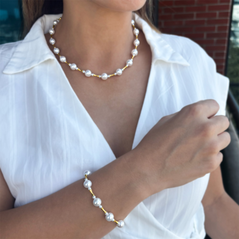 • Ένα βραχιόλι με λευκά στρογγυλά μαργαριτάρια Fresh Water Pearl διαμέτρου 9-10 χιλιοστών, εξαιρετικού γυαλίσματος. Το κολιέ εντυπωσιάζει με το σχέδιό του καθώς τα μεγάλα μαργαριτάρια είναι ανάμεσα σε μικρότερα στρογγυλά μαργαριτάρια διαμέτρου 3,5 χιλιοστών και διάσπαρτα υπάρχουν 7 χρυσά ματ satine στοιχεία 18 καρατίων, σε ιδιαίτερο σχήμα. Το κούμπωμά του είναι χρυσό 14 καρατίων, ενώ είναι δεμένο σε μεταξωτό νήμα που δημιουργεί κόμπους ασφαλείας για λόγους προστασίας των μαργαριταριών. Το μήκος του είναι 18-19  εκατοστά, όμως μπορείτε να το παραγγείλετε στο μήκος που επιθυμείτε.