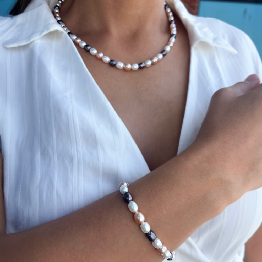 • Ένα βραχιόλι με πολύχρωμα Long μαργαριτάρια Fresh Water Pearl διαμέτρου 7x8 χιλιοστών και κούμπωμα χρυσό 14 καρατίων. Το μήκος του είναι 18-19 εκατοστά, όμως μπορείτε να το παραγγείλετε στο μήκος που επιθυμείτε.