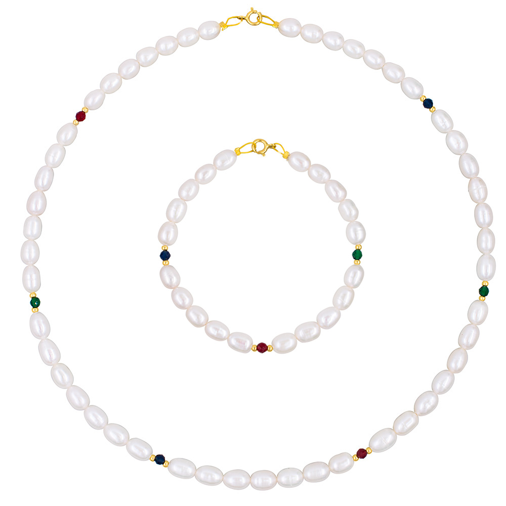 • Ένα βραχιόλι με λευκά μαργαριτάρια Fresh Water Pearl διαμέτρου 5x7 σχήματος Long, με χρυσό κούμπωμα 14 καρατιών. Διάσπαρτα στο κολιέ υπάρχουν 3 φασεταρισμένα ζιργκόν πράσινα, κόκκινα και μπλε, ανάμεσα σε 6 χρυσές μπίλιες 14 καρατίων. Το μήκος του είναι 18-19 εκατοστά, όμως μπορείτε να το παραγγείλετε σε όποιο μήκος επιθυμείτε.