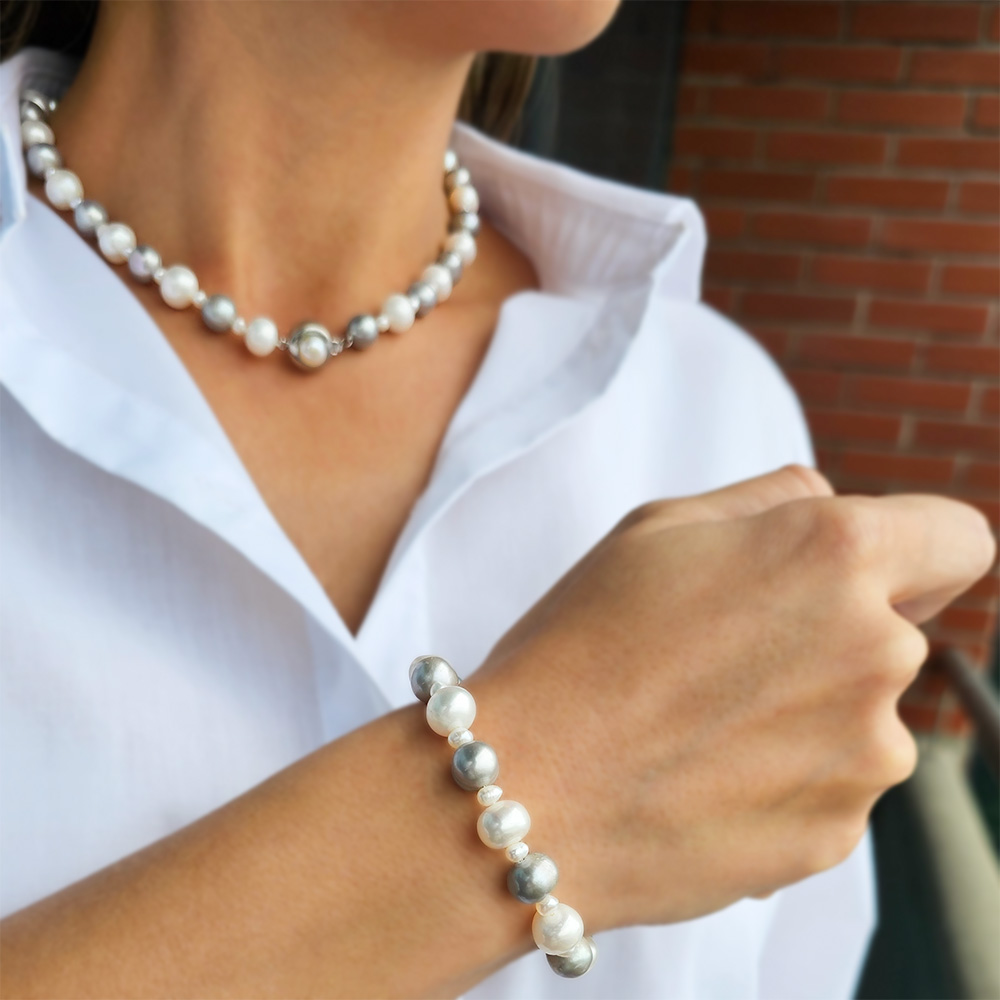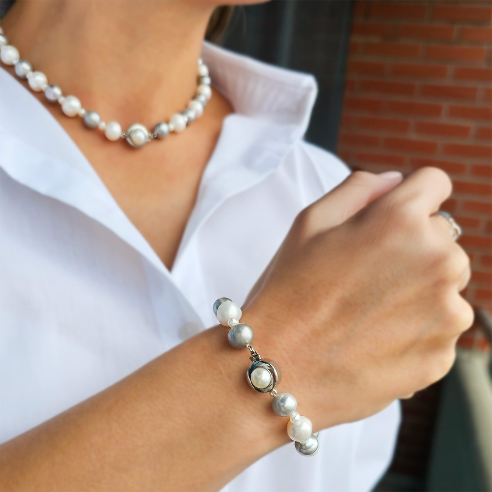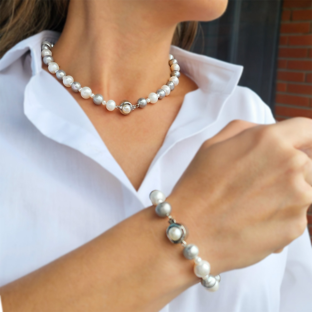 Σετ κολιέ και βραχιόλι με λευκά και γκρι μαργαριτάρια κια κούμπωμα από ατσάλι - S126569