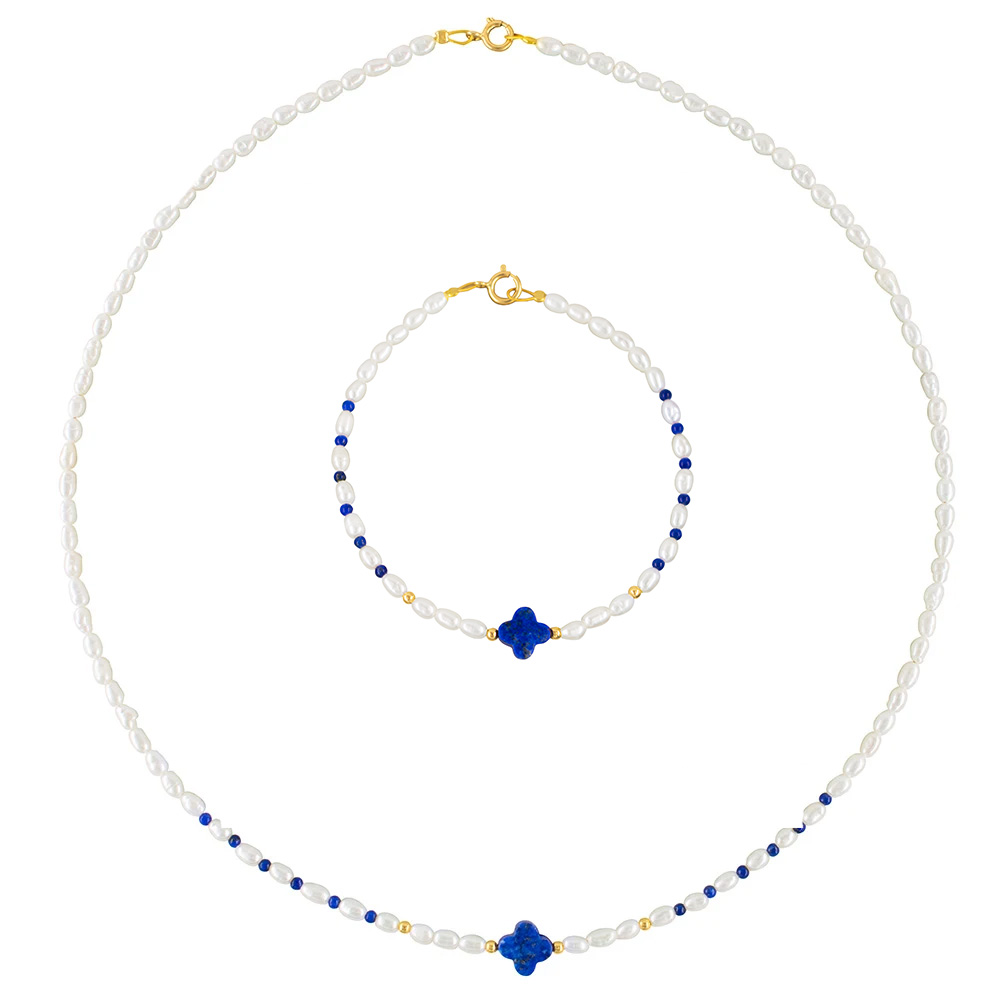 Σετ κολιέ και βραχιόλι με Κ14 χρυσά στοιχεία, λευκά μαργαριτάρια και λάπις λάζουλι - S125925