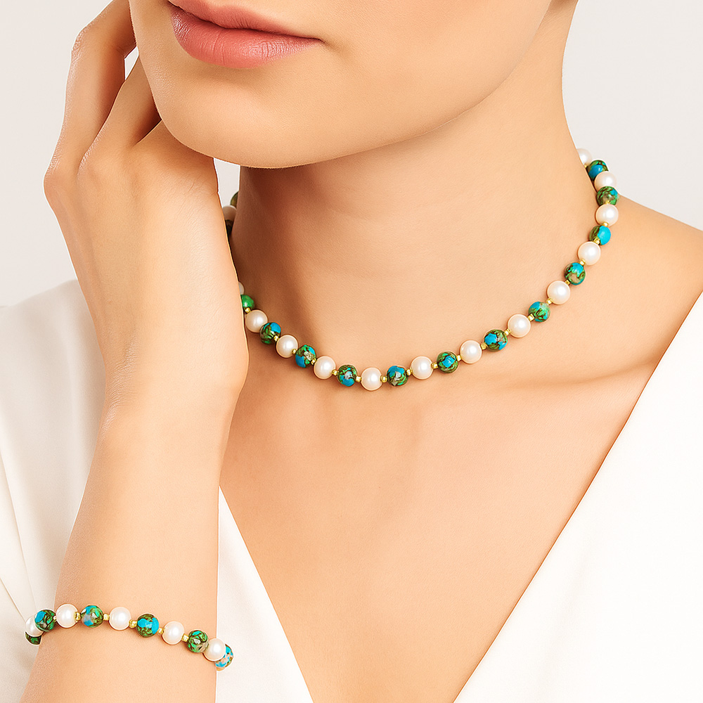 -17% Σετ κολιέ & βραχιόλι με Κ14 χρυσά στοιχεία, μαργαριτάρια και Spiny Oyster - S126429S