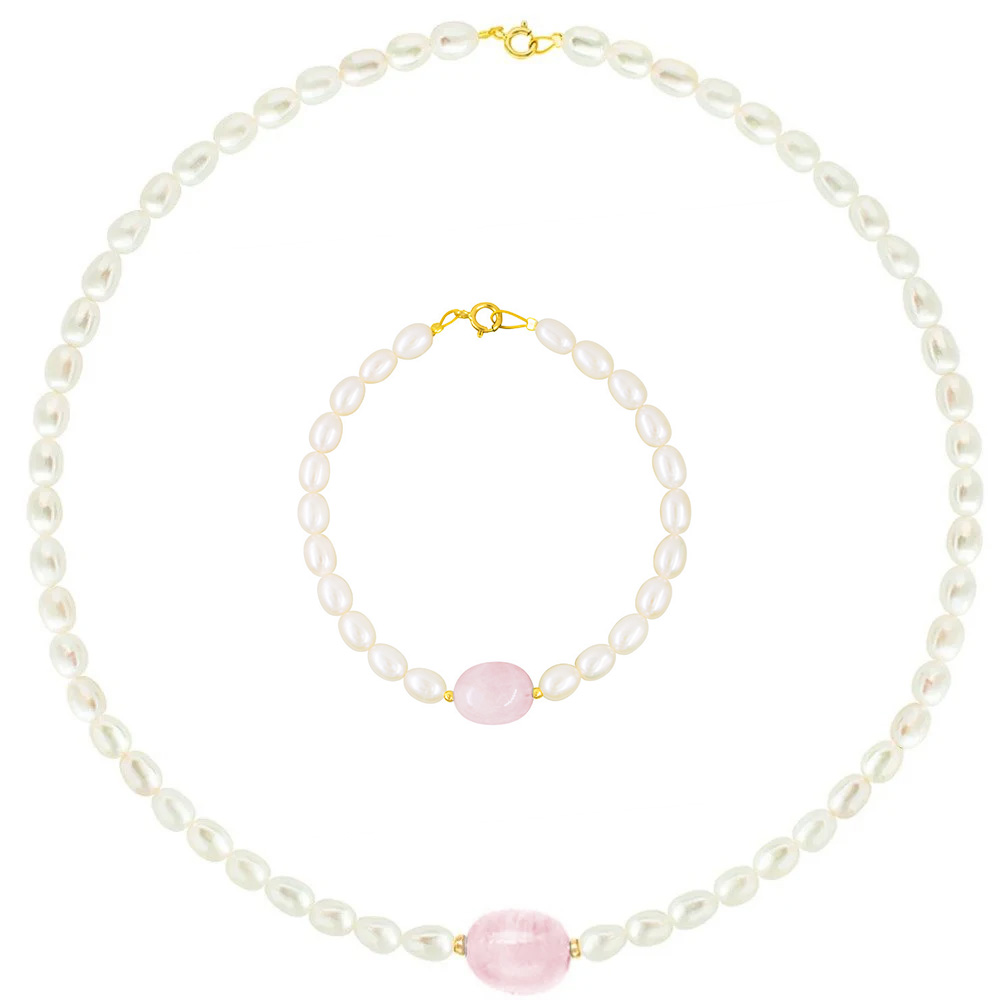 Σετ κολιέ και βραχιόλι με Κ14 χρυσά στοιχεία, λευκά μαργαριτάρια και rose quartz - S126333R