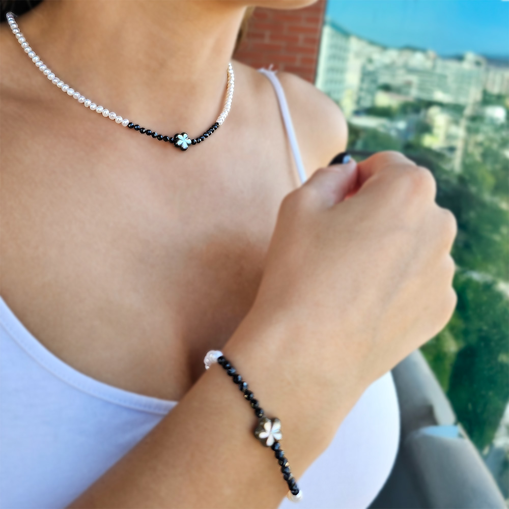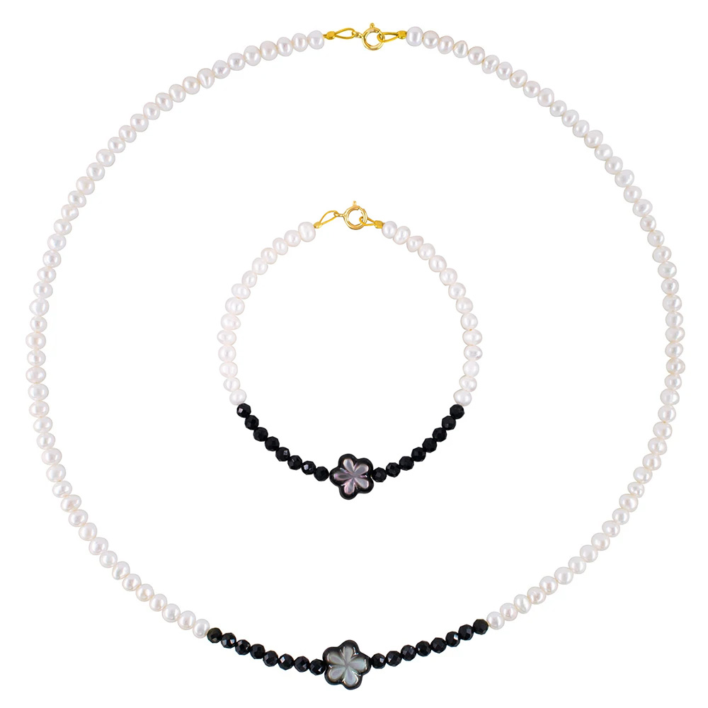Σετ κολιέ και βραχιόλι με Κ14 χρυσά στοιχεία, μαργαριτάρια, spinel και Mother of Pearl - S125638