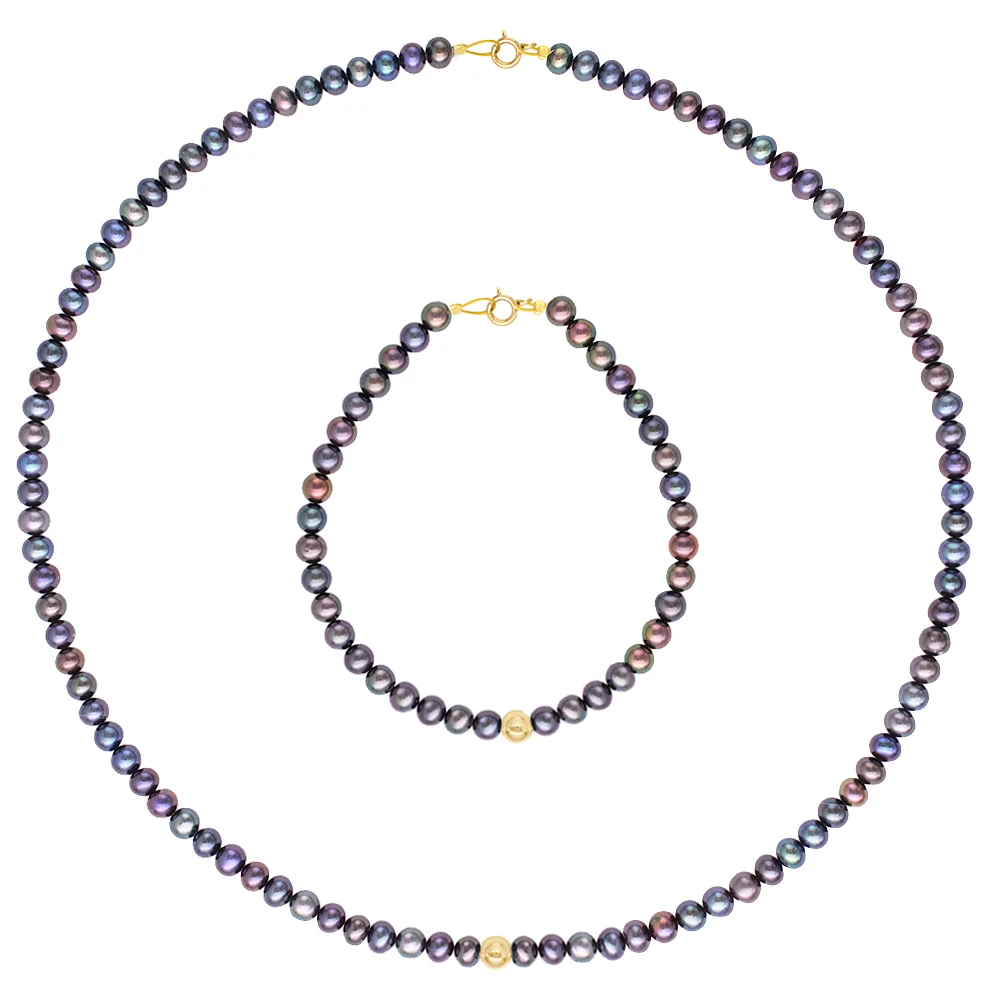 Σετ κολιέ και βραχιόλι με Κ14 χρυσά στοιχεία και μαύρα μαργαριτάρια - F124832B