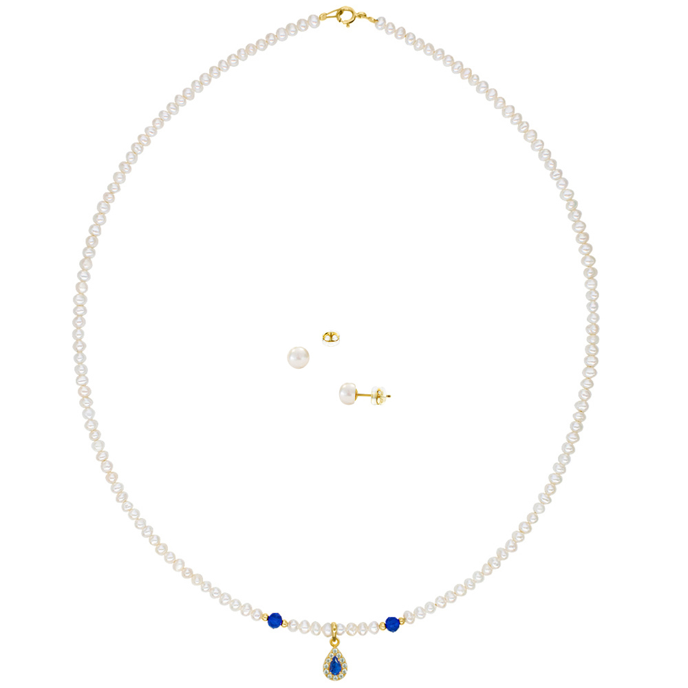 • Ένα εντυπωσιακό κολιέ με λευκά μαργαριτάρια Fresh Water Pearl διαμέτρου 3,5-4 χιλιοστών, με ένα χρυσό μενταγιόν 14 καρατίων στο κέντρο του με μία λαμπερή πέτρα μπλέ ζιργκόν, την οποία γκαλιάζουν 14 λευκές πέτρες ζιργκόν. Υπάρχουν επίσης 2 μπλέ πέτρες ζιργκόν ανάμεσα σε 4 χρυσές μπίλιες 14 καρατίων. Το κούμπωμά του είναι χρυσό 14 καρατίων και το συνολικό του μήκος είναι 43-44 εκατοστά, όμως μπορείτε να το παραγγείλετε σε όποιο μήκος επιθυμείτε.