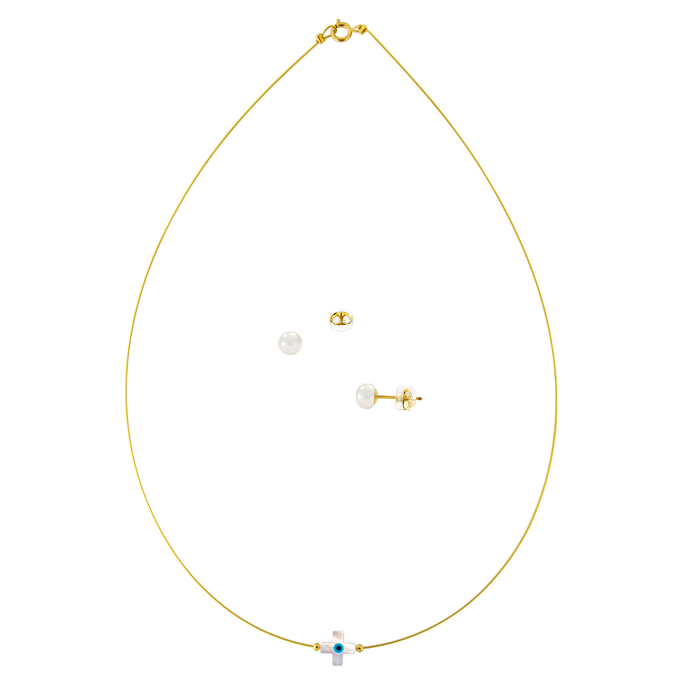 • Ένα κολιέ- γούρι με σταυρό 10 χιλιοστών από μαργαριτοφόρο όστρακο, 2 χρυσές μπίλιες 14 καρατιών και κούμπωμα Κ14, σε ατσαλόσυρμα χρυσού χρωματισμού.