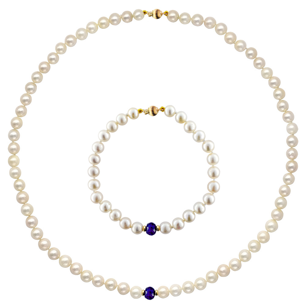 Σετ χρυσό Κ14 κολιέ και βραχιόλι με μαργαριτάρια, ζαφείρια - M122421SS