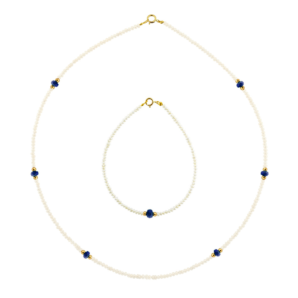 Σετ κολιέ και βραχιόλι με Κ14 χρυσά στοιχεία, μαργαριτάρια και ζαφείρια - M990145S
