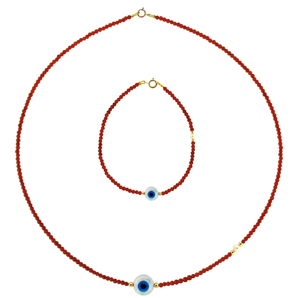 Σετ κολιέ και βραχιόλι με Κ14 χρυσό κούμπωμα, κοράλλια και μαργαριτάρι - M990147C