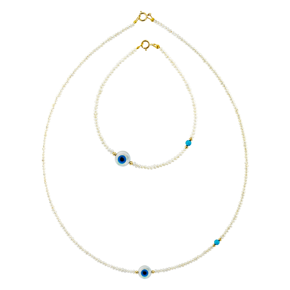 1. Ένα υπέροχο κολιέ με λευκά μαργαριτάρια γλυκού νερού Fresh Water Pearl διαμέτρου 2 - 3 χιλιοστών με χρυσό κούμπωμα 14 καρατίων. Στο κάτω μέρος του υπάρχει ένα ματάκι δημιουργημένο από το εσωτερικό τμήμα μαργαριτοφόρουοστράκου, ανάμεσα σε 2 χρυσά στοιχεία 14 καρατίων. Δεξιά από το ματάκι υπάρχει ένα στρογγυλό φυσικό τιρκουάζ 3,5 χιλιοστών, ανάμεσα σε 2 χρυσά στοιχεία 14 καρατίων. Το μήκος του είναι 43-44 εκατοστά, όμως μπορείτε να το παραγγείλετε σε όποιο μήκος επιθυμείτε.