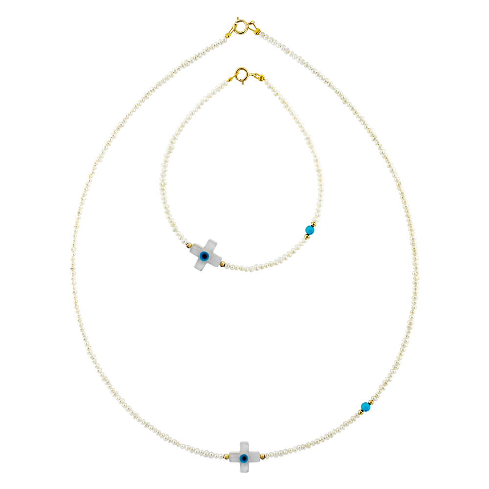 2.  Ένα υπέροχο βραχιόλι από λευκά μαργαριτάρια γλυκού νερού Fresh Water Pearl διαμέτρου 2-3 χιλιοστών. Στο κάτω μέρος του υπάρχει ένας σταυρός με ματάκι, δημιουργημένος από το εσωτερικό τμήμα του μαργαριτοφόρου οστράκου, ανάμεσα σε 2 χρυσά στοιχεία 14 καρατιών. Δεξιά στο ματάκι υπάρχει ένα στρόγγυλο φυσικό τιρκουάζ διαμέτρου 3,5 χιλιοστών ανάμεσα σε 2 χρυσά στοιχεία 14 καρατιών. Διαθέτει επίσης χρυσό κούμπωμα ασφαλείας 14 καρατιών. Το μήκος του είναι 18-19 εκατοστά, όμως μπορείτε να το παραγγείλετε σε όποιο μήκος επιθυμείτε.