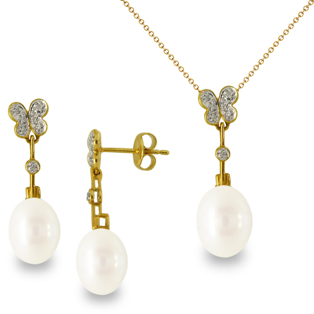 Σετ σκουλαρίκια και μενταγιόν σε Κ18 χρυσό με λευκά μαργαριτάρια και διαμάντια σε χρυσή βάση Κ18 - M990112