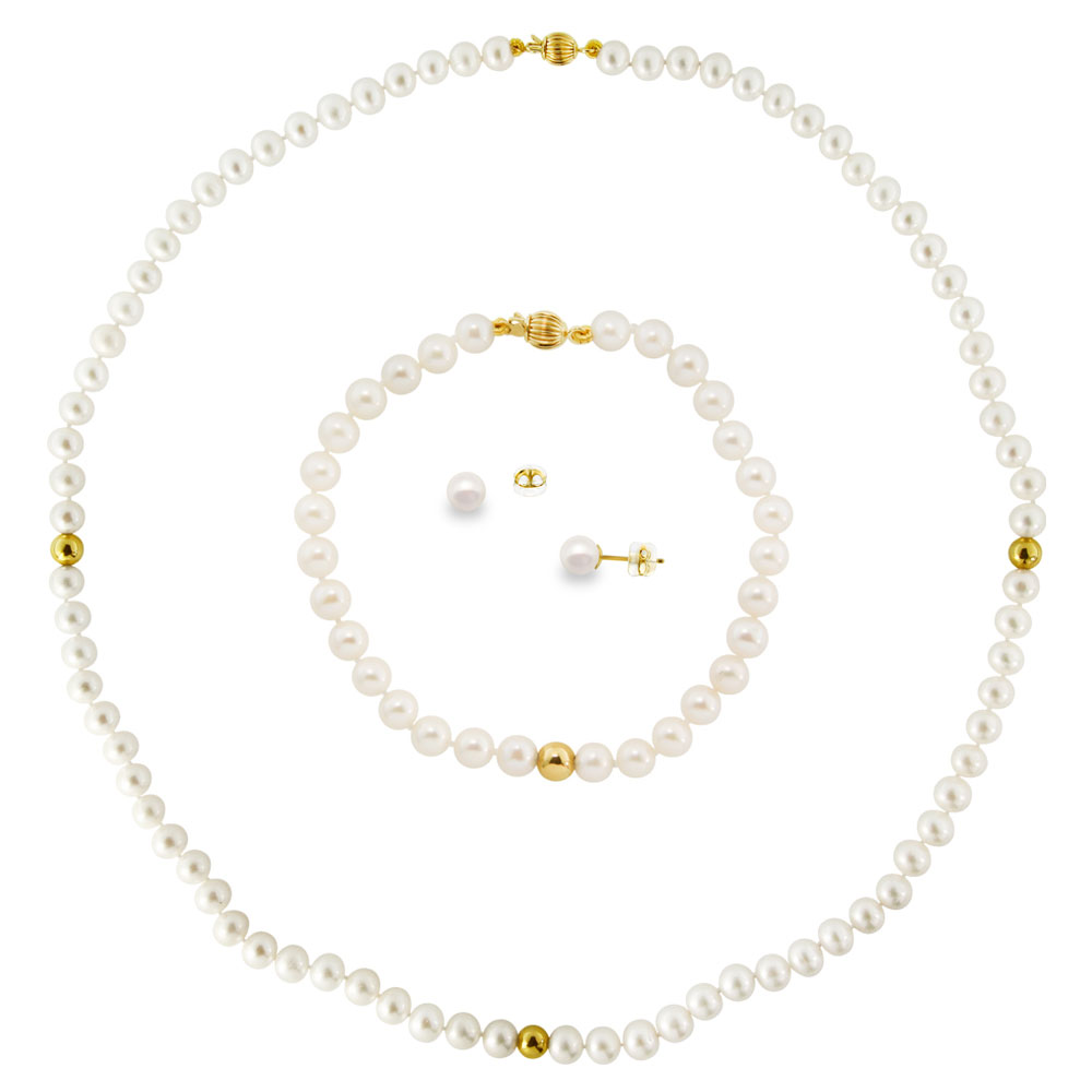 Σετ κολιέ με βραχιόλι και σκουλαρίκια σε Κ14 χρυσό με λευκά μαργαριτάρια - M990079