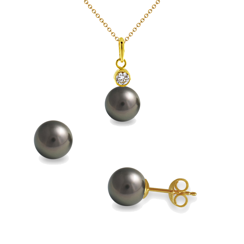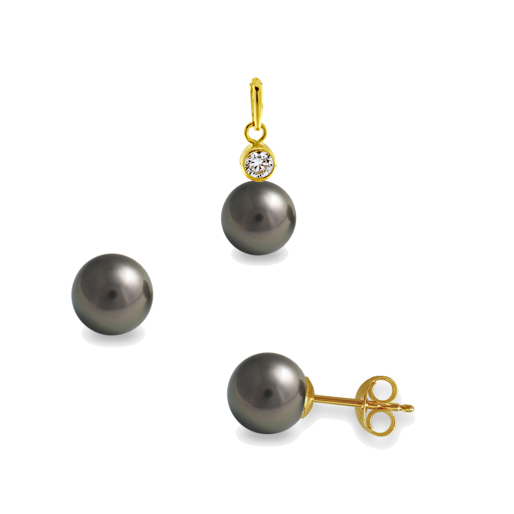 Σετ μενταγιόν και σκουλαρίκια με Κ14 χρυσή βάση και μαύρα μαργαριτάρια και ζιργκόν - L124647B