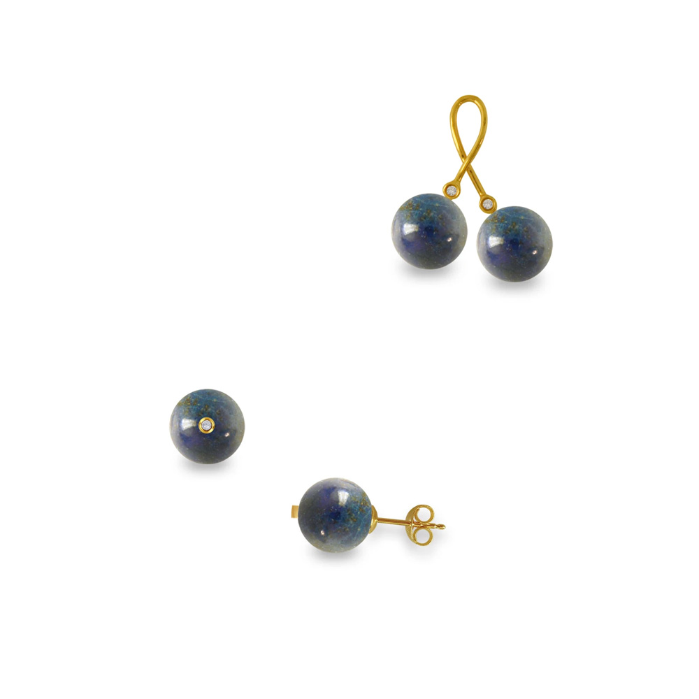 • Ένα ζευγάρι καρφωτά σκουλαρίκια με στρόγγυλους ημιπολύτιμους λίθους λάπις διαμέτρου 8 χιλιοστών. Στο κέντρο κάθε λάπις υπάρχουν 2 διαμάντια 0,02ct σε χρυσό καστόνι 18 καρατίων. Οι βάσεις του είναι χρυσές 14 καρατίων.