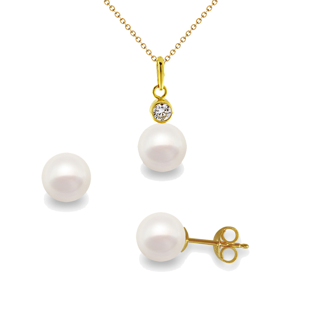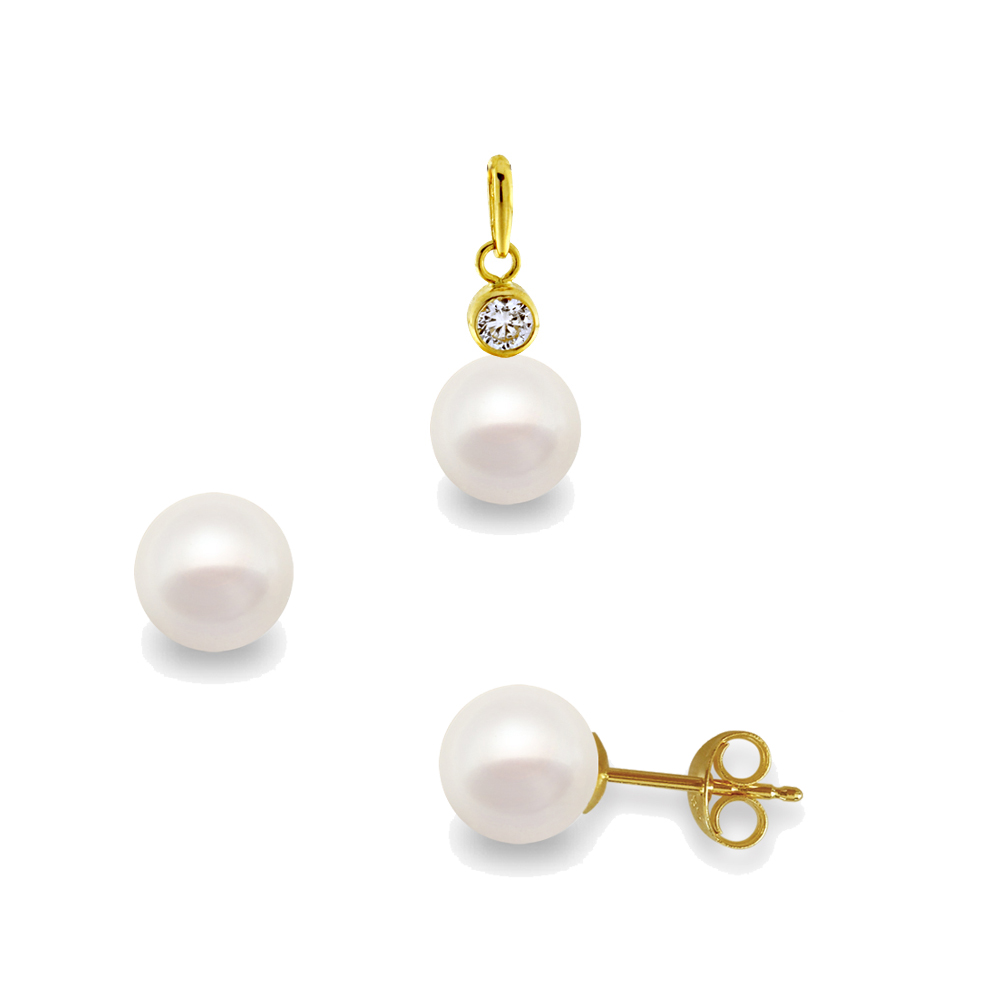 Σετ μενταγιόν και σκουλαρίκια με Κ14 χρυσή βάση και λευκά μαργαριτάρια και ζιργκόν - L124647W