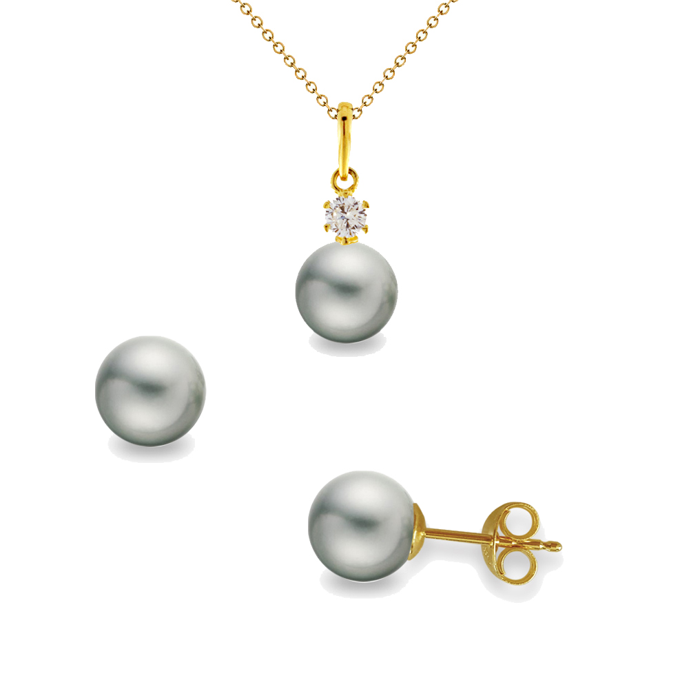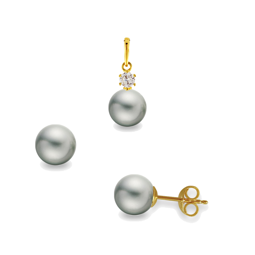 Σετ μενταγιόν και σκουλαρίκια με Κ14 χρυσή βάση και γκρι μαργαριτάρια και ζιργκόν - L124656G