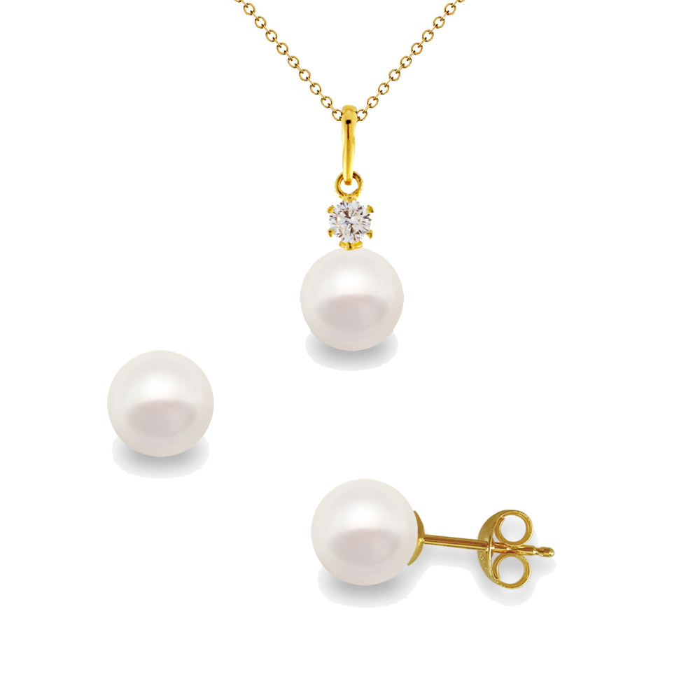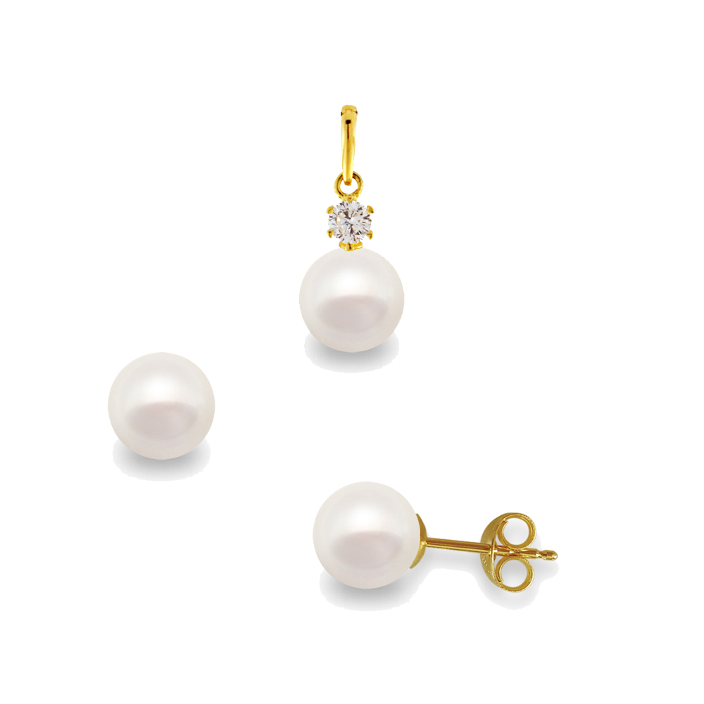 Σετ μενταγιόν και σκουλαρίκια με Κ14 χρυσή βάση και λευκά μαργαριτάρια και ζιργκόν - L124656W