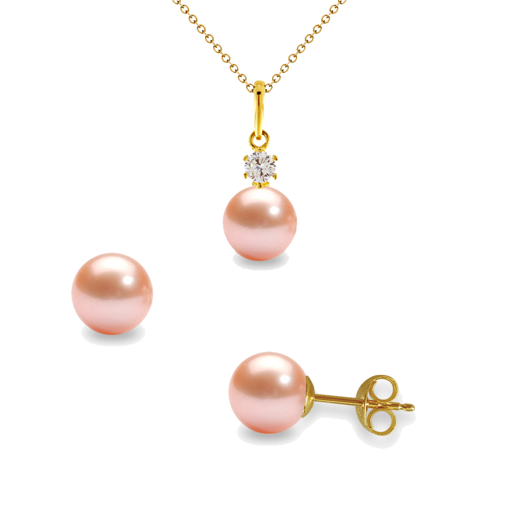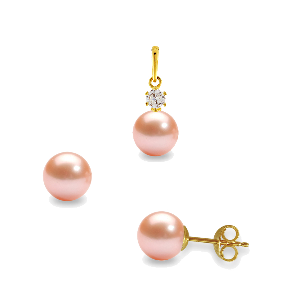 Σετ μενταγιόν και σκουλαρίκια με Κ14 χρυσή βάση και σομόν μαργαριτάρια και ζιργκόν - L124656S