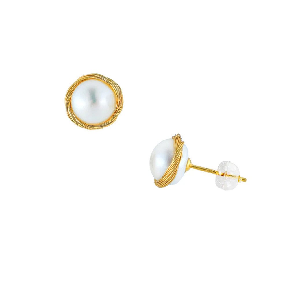 • Ένα ζευγάρι καρφωτά σκουλαρίκια με λευκα μαργαριτάρια Fresh Water Pearl διαμέτρου 9 χιλιοστών σε σχήμα Button και περιμετρικά του υπάρχει ένα πλεκτό επιχρυσωμένο στεφάνι διαμέτρου 11 χιλιοστών. Η βάση του είναι ασημένια 925 επιχρυσωμένη με κούμπωμα σιλικόνης.