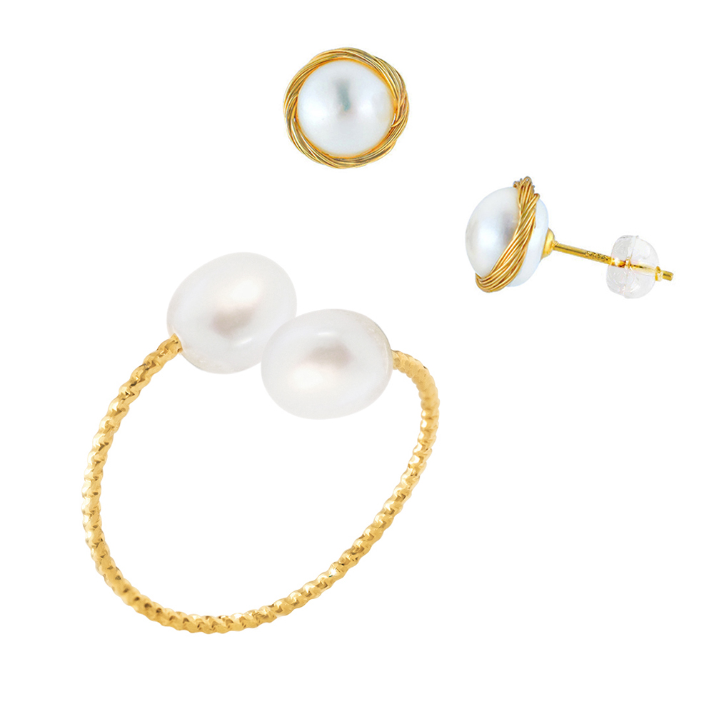 Σετ σκουλαρίκια και δαχτυλίδι με μαργαριτάρια σε ασήμι 925 επιχρυσωμένο - S124615S