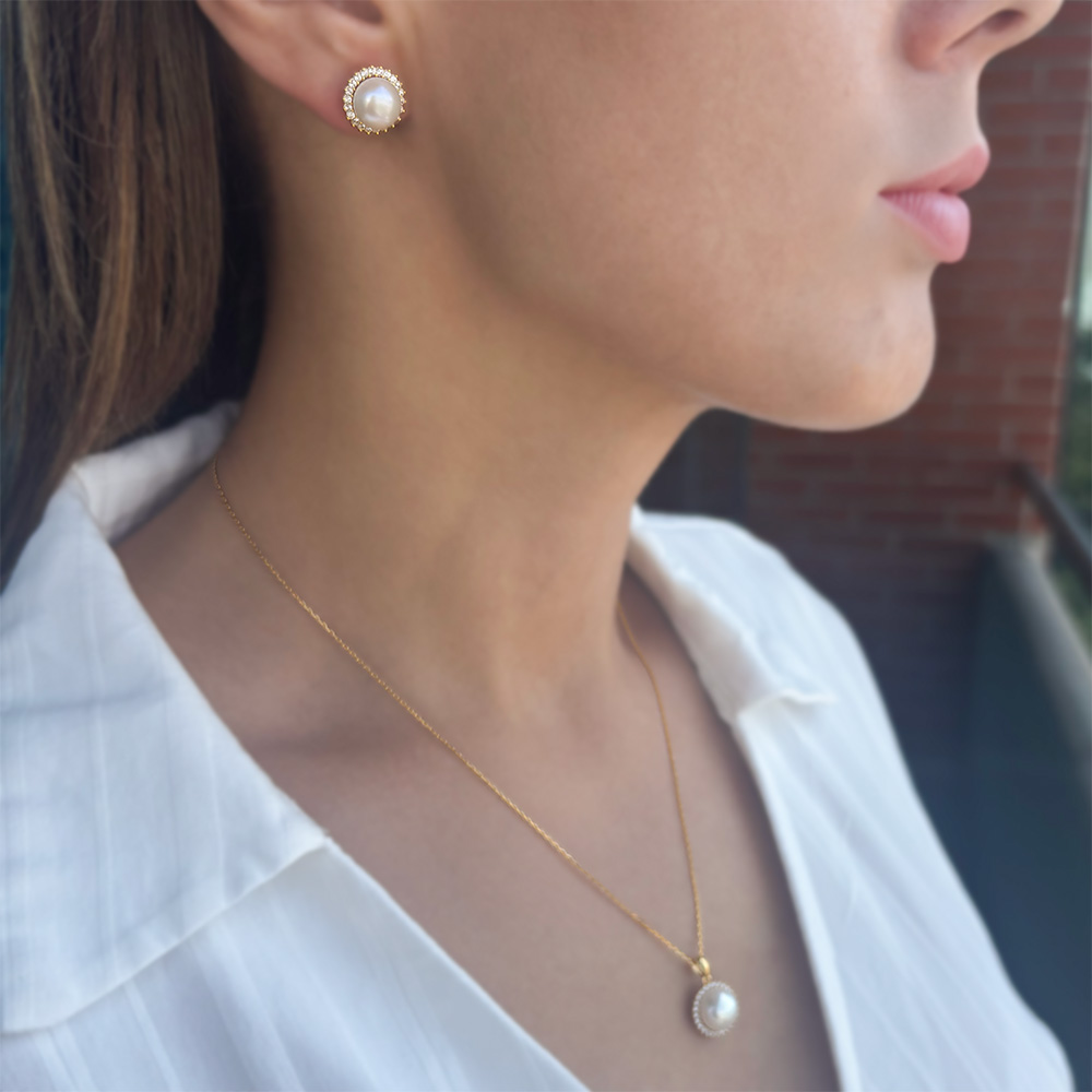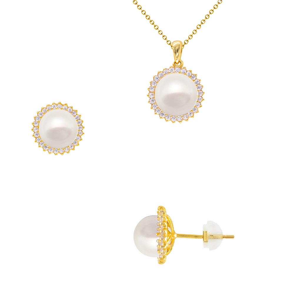 Σετ μενταγιόν και σκουλαρίκια 925 ασημένια επιχρυσωμένα με λευκά μαργαριτάρια και ζιργκόν - S126272S