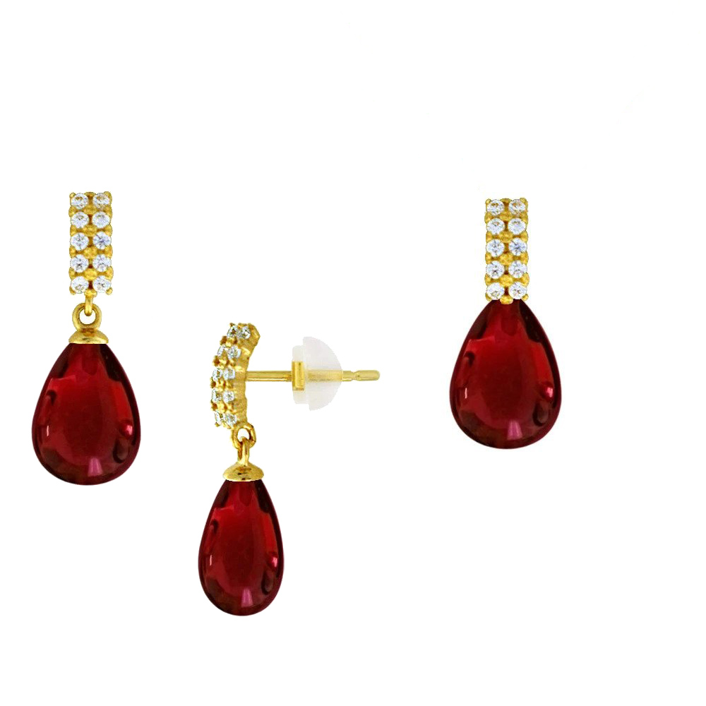1. Ένα φανταστικό ζευγάρι σκουλαρίκια με 2 ημιπολύτιμους λίθους Garnet CZ σε σχήμα Drop (σταγόνα), διαμέτρου 9x12,5 χιλιοστών. Διαθέτει χρυσή βάση 14 καρατίων με συνολικά 20 εντυπωσιακά ζιργκόν.