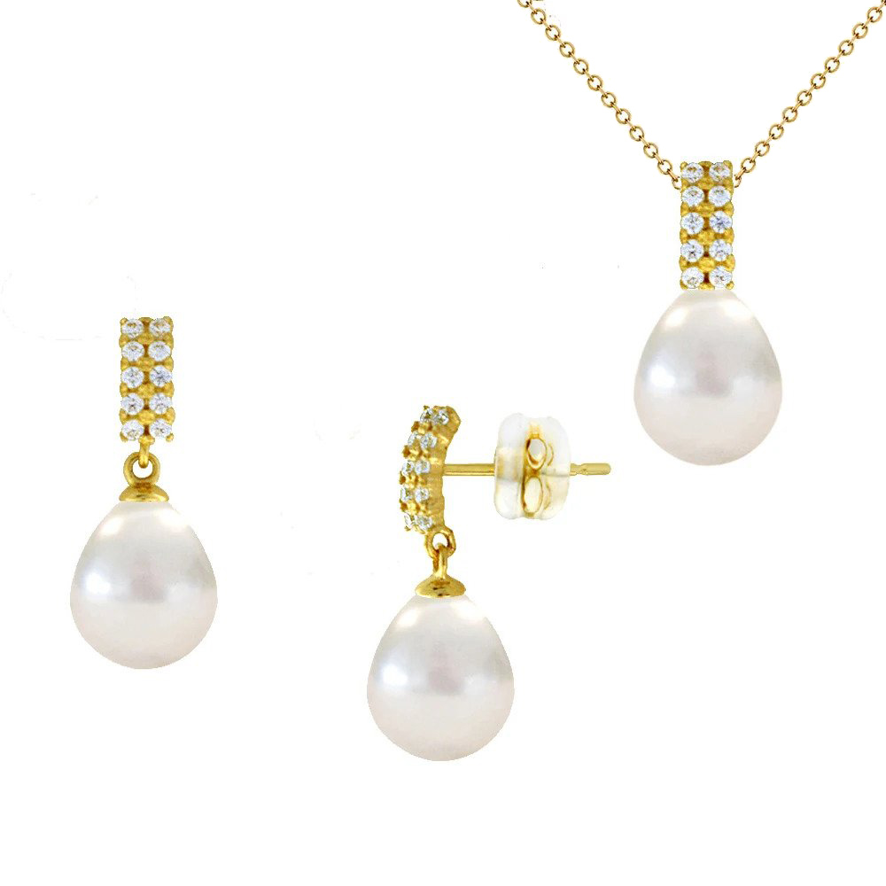 Σετ σε χρυσή βάση Κ14 μενταγιόν και σκουλαρίκια με λευκά μαργαριτάρια - M123953