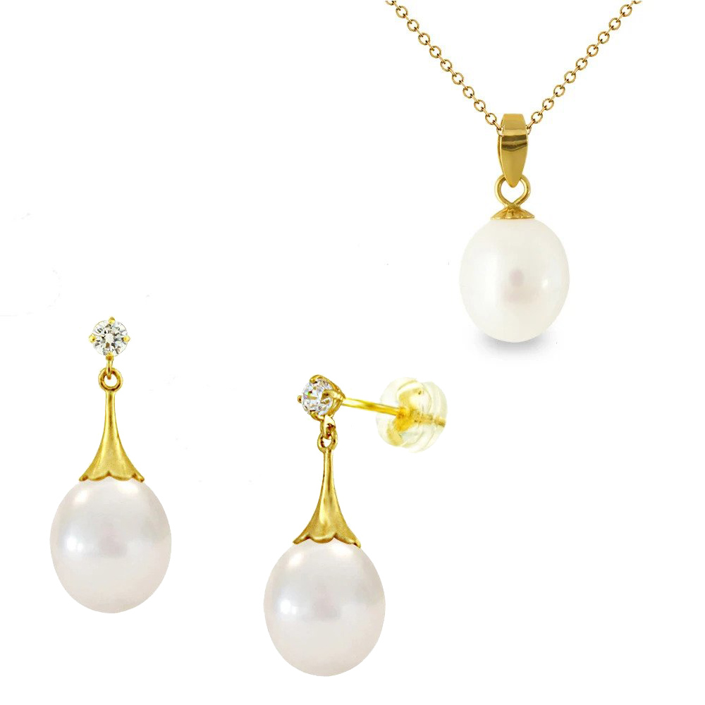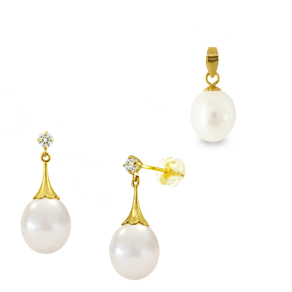 Σετ σε χρυσή βάση Κ14 μενταγιόν και σκουλαρίκια με λευκά μαργαριτάρια - M123955