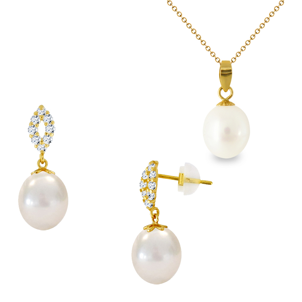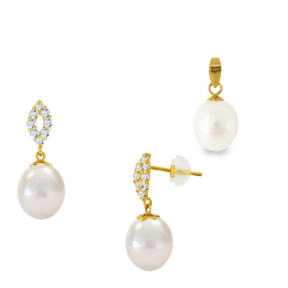 Σετ σε χρυσή βάση Κ14 μενταγιόν και σκουλαρίκια με λευκά μαργαριτάρια - M123956