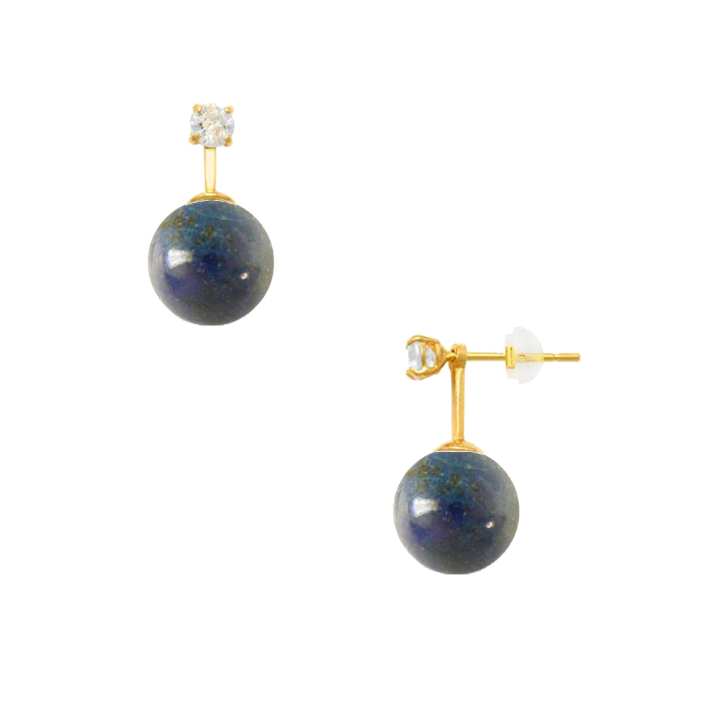 Το ένα τμήμα είναι καρφωτό σκουλαρίκι με ένα λαμπερό ζιργκόν διαμέτρου 3 χιλιοστών, και το άλλο μία χρυσή βάση 14 καρατίων με ημιπολύτιμους λίθους Lapis σε σχήμα Round (σταγόνα), διαμέτρου 8 χιλιοστών με συνολικό μήκος περίπου 1 εκατοστό.